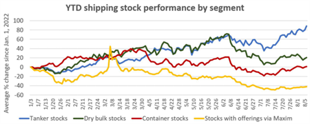 今年以來油輪股價持續(xù)上揚,其間出現(xiàn)了幾次短暫的回調。干散貨航運股則一直與油輪股保持同步,直到6月即期運價下降疊加經(jīng)濟衰退風險才出現(xiàn)股價下跌現(xiàn)象。而7月中旬以來,干散貨航運股略有回升。
