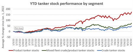 今年油輪股表現(xiàn)因船型而異。成品油輪船東的股價表現(xiàn)遠遠優(yōu)于其他船東,今年迄今為止平均上漲了173%;同時擁有原油輪和成品油輪的船東股價上升了73%;而原油輪船東的股價則上漲了47%。