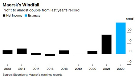 雖然這種差異很大程度上是由于投資者預(yù)計(jì)未來(lái)收益將下降,但對(duì)這家運(yùn)輸巨頭來(lái)說(shuō),這種反差是明顯的,馬士基目前賺的錢(qián)如此之多,其凈利潤(rùn)相當(dāng)于其母國(guó)丹麥GDP的9%左右。