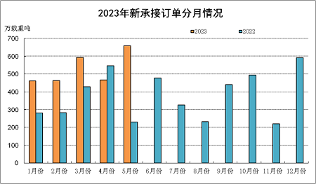 1~5月,48家重點監測造船企業造船完工1612萬載重噸,同比增長17.2%。承接新船訂單2526萬載重噸,同比增長48.3%。5月底,手持船舶訂單11376萬載重噸,同比增長13.2%。