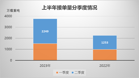 從地區來看,長三角承接了全國72.9%的訂單,環渤海接單量占比19.5%,占比較一季度提高了11個百分點,二季度遼寧省和山東省接單量均實現環比大幅增長,珠三角接單量占比6.3%,較一季度也有所提高。