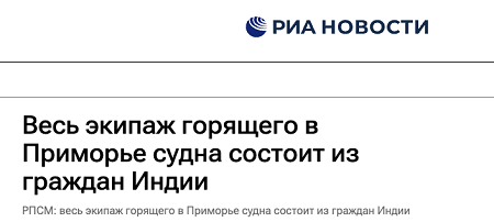 俄羅斯文傳電訊社報(bào)道稱:“根據(jù)失事船只船長(zhǎng)的消息,經(jīng)過(guò)檢查,在機(jī)艙內(nèi)發(fā)現(xiàn)了單獨(dú)的火源。后來(lái)火被撲滅,機(jī)艙內(nèi)仍在冒煙,無(wú)需疏散船員。”