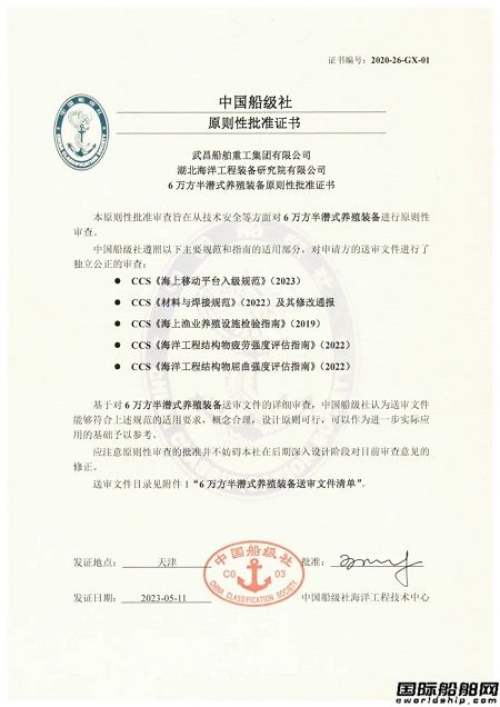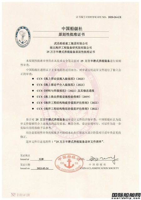 近日,由中國(guó)船舶集團(tuán)武昌造船研發(fā)的新型風(fēng)帆輔助貨滾船獲得法國(guó)船級(jí)社頒發(fā)的原則性認(rèn)可(AIP)證書,研發(fā)的25萬(wàn)方和6萬(wàn)方兩型半潛式智能化養(yǎng)殖裝備獲得中國(guó)船級(jí)社頒發(fā)的原則性認(rèn)可(AIP)證書,為中國(guó)船舶集團(tuán)新藍(lán)色海洋經(jīng)濟(jì)綜合體增添三型新裝備。