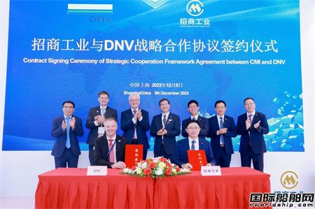招商工業副總工程師劉建成與DNV集團高級副總裁、大中國區總裁Norbert Kray代表雙方簽署戰略合作協議。胡賢甫、Tore Torvbraten等與會領導共同見證簽約活動。