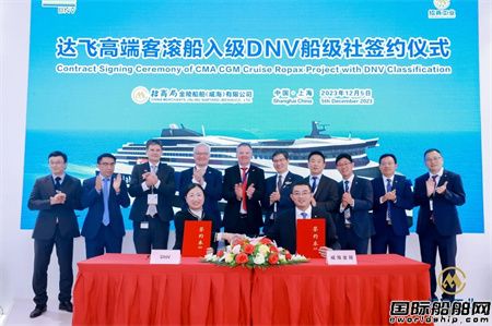儀式上,DNV船級社與招商工業威海金陵并就達飛高端客滾船項目舉行了入級簽約儀式。在陸林、Norbert Kray、胡賢甫等領導嘉賓的共同見證下,威海金陵總經理鄭和輝和DNV船級社北方區經理晏曉琳代表雙方簽署了達飛高端客滾船入級DNV合同。