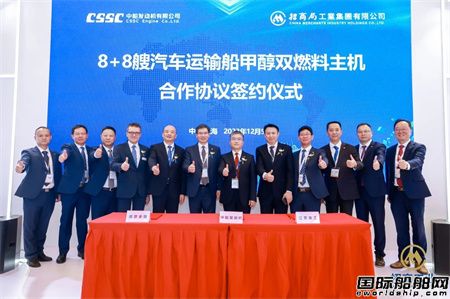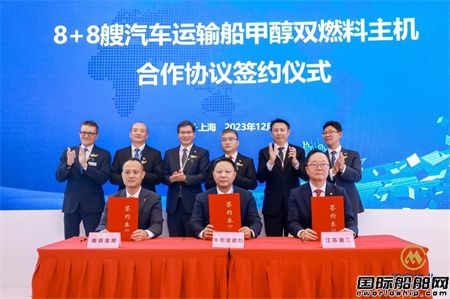 在招商工業與中船發動機甲醇雙燃料主機合作簽約儀式上,中船發動機總經理楊小強、南京金陵常務副總經理丁健亮、江蘇重工副總經理陳濤,共同簽署了8+8艘汽車運輸船甲醇雙燃料主機采購合同。招商工業總經理胡賢甫,招商輪船總輪機長吳建移,中船集團經濟運行部副主任張鑫,中船發動機董事長付向昭,招商工業副總經理吳四川、梅先志、梅中華,曼恩能源方案集團低速機營銷負責人托馬斯·漢森等領導嘉賓參加簽約活動。