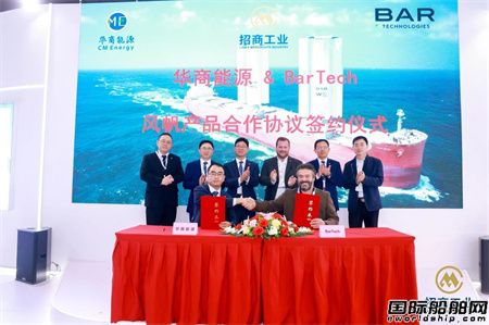在招商工業控股企業華商能源與英國BART公司剛性風帆合作簽約儀式上,華商能源CEO詹華鋒和BART公司總裁John Cooper先生共同簽訂合作協議。BAR Technologies CTO Simon Schofield先生,招商工業副總經理吳四川、梅先志等領導嘉賓見證簽約。