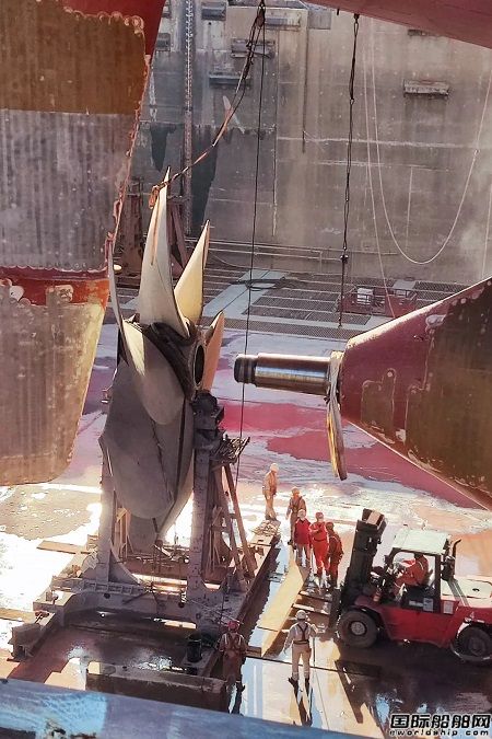 “MSC菲爾”輪在塢19天塢內現(xiàn)場機械轟鳴、塔吊林立,工人忙碌呈現(xiàn)一派熱火朝天的施工景象,水線下工程完成ICCP換新6套、MGPS換新8套,原80噸重車葉換新為59噸重新車葉3臺艏艉側推拆檢等等。