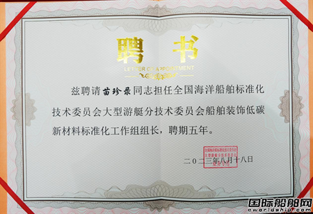 全國海洋船舶標(biāo)準(zhǔn)化技術(shù)委員會大型游艇分技術(shù)委員會船舶裝飾低碳新材料標(biāo)準(zhǔn)化工作組組長 聘任證書