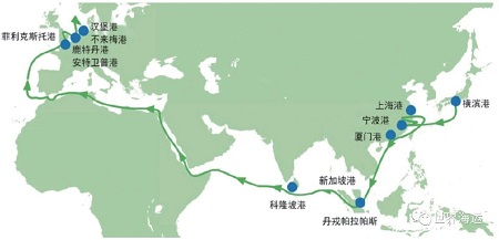 2022年8月,新加坡海事及港務管理局和鹿特丹港務局簽署諒解備忘錄,合作建立世界上最長的綠色與數字航運走廊——亞歐集裝箱綠色航運走廊 ( 見圖2 ),以實現低碳和零碳航運為發展目標[5]。亞歐集裝箱綠色航運走廊作為全球性走廊的代表,起運港上海港是世界集裝箱吞吐量第一大港,中轉港新加坡港是世界上功能最完整的樞紐港,目的港為歐洲核心港口組群,船舶綠色燃料加注體系完備,航線上強大的港口組團為綠色航運走廊建設奠定了基礎。