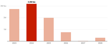 在馬士基擔心新船潮的同時,赫伯羅特似乎更冷靜一些。該公司首席執行官Rolf Habben Jansen表示:“當你分析新船涌入的影響時,你會發現24年和25年的新船會比23年多得多,因為絕大多數新船從今年下半年才開始進入市場,尤其是在24年和25年。”