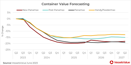 •集裝箱船價值從第一季度開始攀升,但仍比2022年第二季度的水平低50-70%。