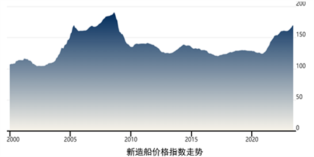 新造船價格創2009年以來新高。以克拉克森的船價為例,6月新造船價格指數收報170.9點,實現連續5個月增長,較年初增長5.6%。VLGC、大型/超大型箱船、成品油船、PCTC等一批市場熱門的船型船價明顯上漲的同時,也在帶動整體市場繼續增長。當前的新造船價格變化很大程度上反映了市場的供求關系,說明市場的需求依然可觀,未來在航運減排加速的背景下,也有繼續維持高位的基礎。