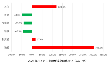油船奪得半年成交冠軍,船型輪動的趨勢明顯。上半年,成交船型以CGT計的份額占比從高至低依次為油船(23%)、氣體運輸船(21%)、集裝箱船(21%)、散貨船(20%)、其它船舶(14%)以及客船(1%)等。油船、特種船舶(其它船舶)市場上半年成交量大幅增加。其中,油船漲幅達到303%,對新造船市場的貢獻最大,也超過氣體船和集裝箱船成為半年的成交冠軍;特種船舶市場在汽車運輸船的加持下漲幅也是十分明顯。兩種主力船型的表現符合之前的預期。而散貨船同比17.6%的漲幅則帶來不小“驚喜”,說明下游運費收益的好壞已經不是決定新造船市場的唯一因素。