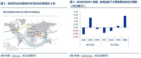 運(yùn)距放大效應(yīng),邊際新增需求為長運(yùn)距。2019與2017年相比原油海運(yùn)量增加44.4萬桶/天,美國原油出口增加186萬桶/天,貢獻(xiàn)總出口增量的319%。亞洲原油進(jìn)口增加157萬桶/天,貢獻(xiàn)總進(jìn)口增量的254%,在美國出口替代中東的大趨勢下,邊際增量均為長運(yùn)距。