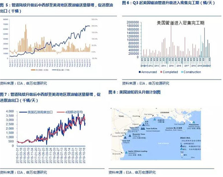 美國原油出口占產(chǎn)量的比例不到30%,影響美國原油出口的因素主要為碼頭和管道等基礎(chǔ)設(shè)施。2018年以來,碼頭和管道基礎(chǔ)設(shè)施陸續(xù)升級。