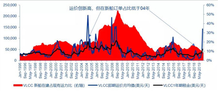 (1)交付高峰結(jié)束,當(dāng)前VLCC新船在建訂單占比已從15年接近20%水平下滑至9%,2004年為18%,供給壓力低于2004年大周期啟動水平。