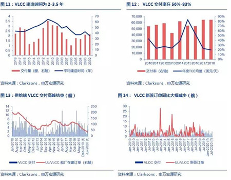 (3)長期供給仍將受限,新增產(chǎn)能難以大幅增長。我們認(rèn)為在造船產(chǎn)能收縮,環(huán)保約束趨嚴(yán),LNG動力船舶技術(shù)尚不成熟,船公司資產(chǎn)負(fù)債表尚未修復(fù)的背景下,新船訂單難以大幅增長。新船訂單同比大幅下滑,2019年1-10月,VLCC新船訂單12艘,同比下降73%,遠(yuǎn)低于59艘的交付數(shù)量,進(jìn)一步驗證我們的觀點(diǎn)。