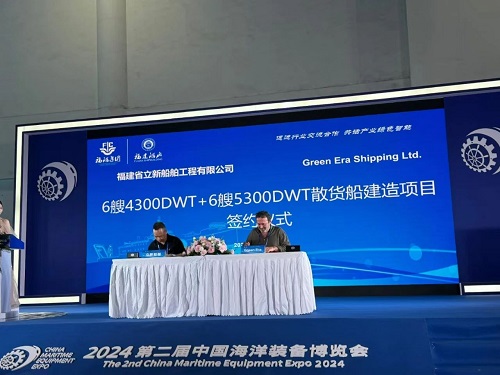 11月15日,在2024中國海洋裝備博覽會期間,立新船舶與土耳其船東Green Era Shipping簽署6艘4300載重噸和6艘5300載重噸散貨船建造合同。