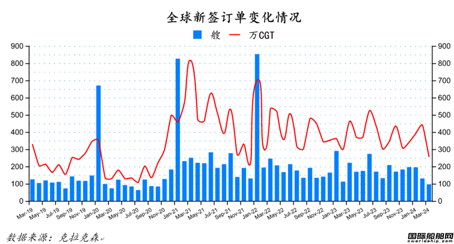 根據克拉克森最新數據統計(截至2024年4月9日),2024年3月份全球新簽訂單96艘,共計2,597,141CGT。與2024年2月份全球新簽訂單130艘,共計4,432,942CGT相比較,數量環比減少34艘,修正總噸環比下降41.41%。與2023年3月份全球新簽訂單221艘,共計4,664,718CGT相比較,數量同比減少125艘,修正總噸同比下降44.32%。