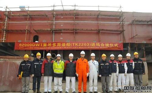 1月26日上午,為嵊泗浦盛海運(yùn)建造的第二艘62000噸重吊多用途船(TK2203)舉行進(jìn)塢合攏儀式。生產(chǎn)部、質(zhì)量管理部、船塢車間負(fù)責(zé)人與船東、船檢出席儀式并合影留念。該船總長199.9米,型寬32.26米,型深19.30米,設(shè)計(jì)吃水11.30米,設(shè)計(jì)航速14.4節(jié),入級(jí)法國船級(jí)社(BV)。