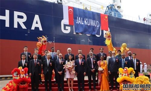 教母JALDHI董事Upasana Bothra女士命名該船為“JAL KUMUD”輪,并擲香檳禮。鞭炮、禮花齊響,汽笛共鳴,龍獅共舞。祝福新船、隨船船員航行平安,為建造方帶來榮譽,為船東帶來好運與財富。