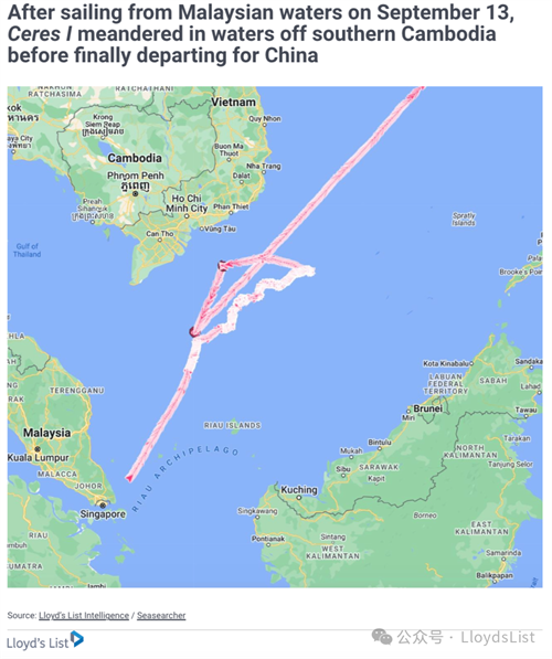 在離開馬來西亞水域近六周后,該油輪的行程并不簡單。數(shù)據(jù)顯示,這艘23年的老舊油輪分別在柬埔寨南部的國際水域停泊了五天和四天。