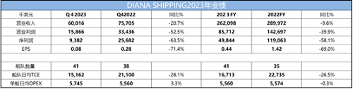 2023年全年,戴安娜航運實現營業收入2.6億美元,同比下降9.6%;營業利潤8571.2萬美元,同比下降39.9%;凈利潤為4984.4萬美元,同比下降58.1%;歸屬于普通股股東的凈利潤為4407.5萬美元,或每股凈利0.44美元。