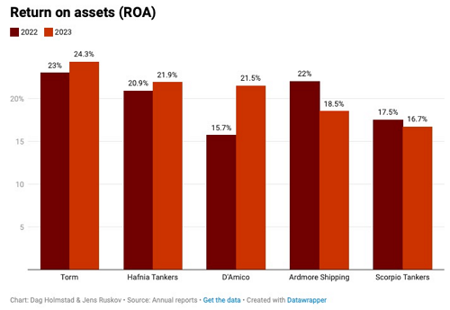 就資產回報率(ROA)而言,Torm則在2023年和2022年都是最高的,分別達到23%和24.3%。