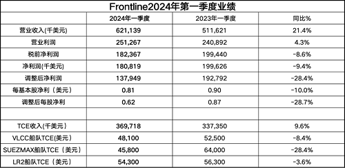 2024年第一季度,F(xiàn)rontline實現(xiàn)營業(yè)收入6.2億美元,同比增長21.4%;營業(yè)利潤達到2.5億美元,同比增加4.3%;凈利潤達到1.8億美元,同比減少9.4%;調整后的凈利潤為1.4億美元,或調整后每股凈利0.462元,同比減少28.7%。