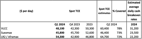 2024年第一季度,F(xiàn)rontline在現(xiàn)貨市場運營的VLCC、蘇伊士型油輪和LR2型油輪平均日租金分別為48100美元、45800美元和54300美元,同比分別減少8.4%、減少28.4%和減少3.6%。
