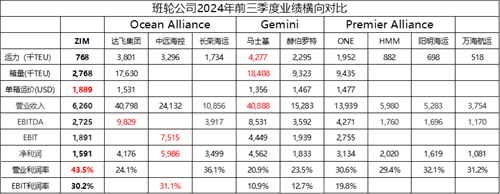 2024年前三季度,ZIM承運箱量達276.8萬TEU,同比增長10.9%;單箱平均運費為1889美元,同比增長53.0%;實現營業收入62.6億美元,同比增長58.2%;EBIT為18.7億美元;稅前利潤為16.0億美元;凈利潤為15.9億美元;調整后的EBITDA為27.2億美元;調整后的EBIT為18.9億美元;調整后的EBITDA和EBIT利潤率分別為43.5%和30.0%。