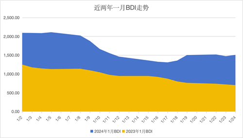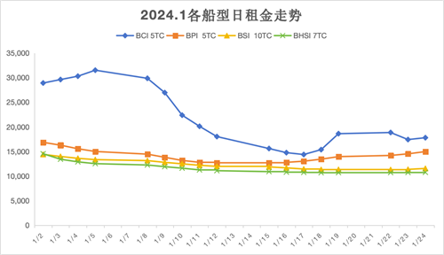 1月24日,波羅的海干散貨運價指數(BDI)為1,507點;波羅的海海岬型船運價指數(BCI)為2,145點;波羅的海巴拿馬型船運價指數(BPI)為1,663點;波羅的海超靈便型船運價指數(BSI)為1,050點;波羅的海靈便型船運價指數(BHSI)為597點。