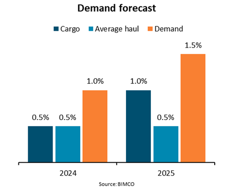 根據BIMCO首席分析師Niels Rasmussen的預測,基于基本面,2024 年貨運需求將增長 0-1%,2025 年增長 0.5-1.5%。與先前的預測相比,2024 年和 2025 年均下降了 0.5 個百分點。原因是可再生能源發電加速,煤炭前景轉弱。