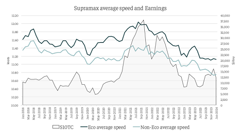 Intermodal 研究部主管 Yiannis Parganas 表示:“尤其值得注意的是,盡管收入有所增長,但這一趨勢在 2023 年中期以后并未發生逆轉。平均航速繼續下降,環保型船在 2023 年下半年航速表現出相對穩定,但非環保型船不同。具體而言,在2023 年,超靈便型航線(10TC)平均租金價格與環保船和非環保船航速呈負相關,這是一年中首次出現超過兩個月沒有正相關的情況。”