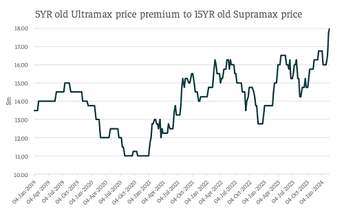 “這一點在我們下面的圖表中得到了進一步例證,該圖表強調了 5 年船齡的 Ultramax 型船相對于 15 年船齡的 Supramax 型船的溢價。根據船廠建造情況的平均價格計算,目前的溢價為 1,800 萬美元,創歷史新高。與舊船船東相比,新法規(EEXI/CII 和 ETS)為環保型船船東提供了更大的運營靈活性,可在更強的貨運市場條件下以更高的速度運營。這一因素,再加上二手市場上環保型船的稀缺導致了當前的溢價。”