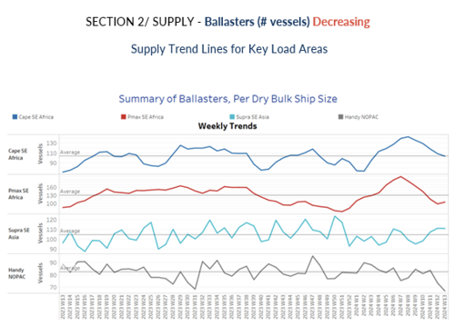 根據Signal的每周干散貨市場監測,在截至3月27日的一周內,所有船型的壓載量均呈下降趨勢。其中,非洲東南部的海岬型散貨船壓載量為103艘,已接近年平均水平,環比減少近 12 艘,較今年第 8 周觀察到的峰值相比顯著下降 27%;非洲東南部的巴拿馬型散貨船壓載量降至 105 艘,維持在過去兩周低于年平均水平的水平;相較之下,東南亞區域的超靈便型散貨船壓載量表現略好,壓載量超過100艘,連續3周呈上升趨勢;而NOPAC靈便型散貨船壓載量首次低于年平均水平。