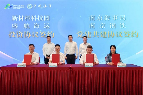 現場,南京江北新區與南京海事局簽訂合作協議,雙方將在江北新區港口能級提升、多式聯運主樞紐建設、臨港產業集群發展、現代航運產業集聚區建設等方面深化戰略合作,加快江北新區建設步伐,促進中國(江蘇)自由貿易試驗區南京片區開放發展。南京海事局與南京鋼鐵股份有限公司簽訂黨建共建協議,南京江北新區新材料科技園與南京盛航海運有限公司簽訂投資協議。