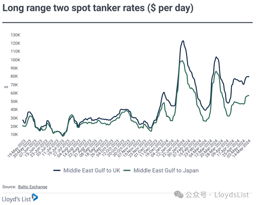 根據波羅的海交易所的數據,五月份的平均運費為79,100美元/日,而2024年前三個月的平均運費為74,600美元/日。