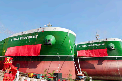 廣船國際長期致力于綠色船舶的研發和建造,尤其在油船領域,是我國承建首個甲醇雙燃料油船項目的船廠。2022年6月,廣船國際交付了由StenaProman訂造的6艘49990載重噸甲醇雙燃料化學品/成品油船的首制船,2023年底,5號船“Stena Provident”和6號船“Stena Progressive”完成命名,該系列船配備世界領先的甲醇雙燃料驅動系統,可采用燃油、燃油水合物、甲醇、甲醇水合物等四種燃料模式驅動,能夠通過控制燃料狀態來減少廢氣污染,并配置了前置導輪、消渦鰭等節能裝置,可有效提升推進效率,減少能源消耗,降低船舶營運成本,是一型世界領先的綠色環保型船舶。