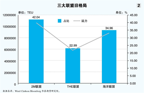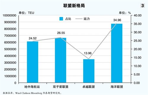 關(guān)于未來(lái)市場(chǎng)走向,高聰提醒幾個(gè)關(guān)注點(diǎn)。首先是美國(guó)大選對(duì)航運(yùn)市場(chǎng)的影響。特朗普的再度當(dāng)選可能會(huì)引發(fā)貨物搶運(yùn),對(duì)美線價(jià)格形成一定支撐,而對(duì)歐線的影響較小。2018年中美貿(mào)易爭(zhēng)端期間,搶出口現(xiàn)象曾導(dǎo)致運(yùn)價(jià)飆升,這一歷史經(jīng)驗(yàn)值得市場(chǎng)參與者關(guān)注。其次是新聯(lián)盟的建立對(duì)航運(yùn)市場(chǎng)的影響。隨著2M聯(lián)盟的分拆和雙子星聯(lián)盟的形成,航運(yùn)市場(chǎng)的運(yùn)力格局或?qū)l(fā)生重大變化(見圖2、圖3 ),新聯(lián)盟的運(yùn)作模式、航線布局和合作方式都將對(duì)航運(yùn)價(jià)格和服務(wù)質(zhì)量產(chǎn)生深遠(yuǎn)影響。