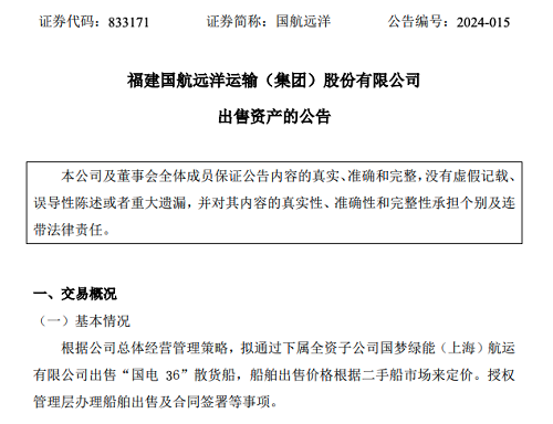 同日,國航遠洋在另一份公告中表示,根據(jù)公司總體經營管理策略,擬通過下屬全資子公司國夢綠能(上海)航運有限公司出售“國電 36”散貨船,船舶出售價格根據(jù)二手船市場來定價。授權管理層辦理船舶出售及合同簽署等事項。