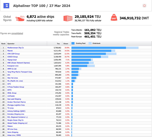 根據Alphaliner最新數據,在全球班輪公司運力100強中,寧波遠洋排名第25,共運營81艘船,總運力76531TEU,其中自有船舶37艘、租入船舶44艘。此外,寧波遠洋持有8艘,總計7072TEU新造船訂單。