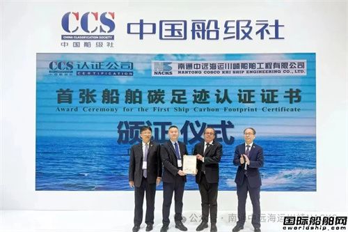 南通中遠海運川崎8.2萬噸散貨船獲頒首張船舶產品碳足跡標識認證證書