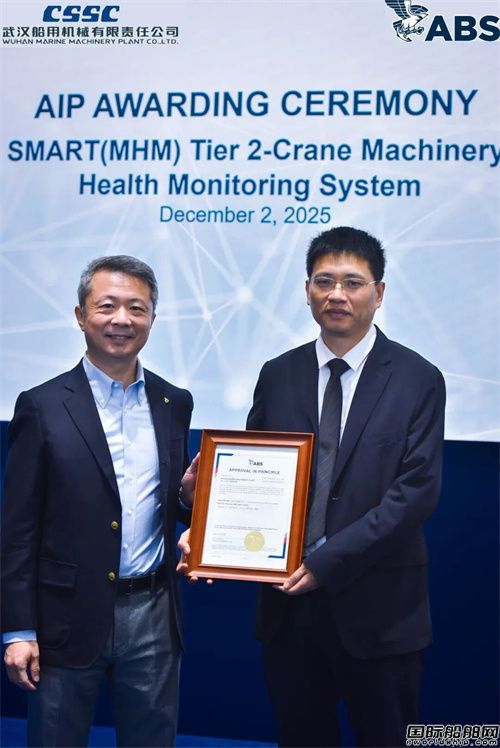 12月2日,2025年中國國際海事技術學術會議和展覽會開幕首日,中船武漢船機開發的海工吊機智能化健康監測系統(SMART系統)獲得美國船級社SMART(MHM TIER 2)原則性批準(AIP),這是國內海工吊機首個成功取得該AIP認證的系統。美國船級社技術副總裁谷海、中船武漢船機副總經理胡發國出席發證儀式。