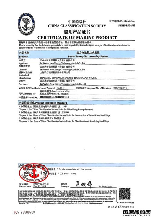 與此同時,聚焦內河新能源基礎設施共擔共享生態建設,三點水新能源與國軒高科聯合研發的新型船用PACK換電電池系統,成功斬獲中國船級社(CCS)電芯、模組及電池包的型式認可證書、產品證書,以及“動力電池箱總成系統”產品證書。該系統以高安全、高適配性為核心優勢,為船舶新能源動力系統提供兼具安全冗余與高效性能的“三點水核心方案”,填補了內河新型船用PACK換電標準化應用的行業空白。