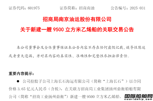 根據公告,為優化公司乙烯船隊運力結構,改善船隊運營能力,鞏固公司在乙烯運輸市場的領先地位,招商南油董事會同意下屬控股子公司上海長石海運有限公司以合同價格3.65億元人民幣(含稅),在關聯方招商局工業集團揚州鼎衡船舶有限公司新建一艘9500立方米乙烯船,預計2028年上半年交付。