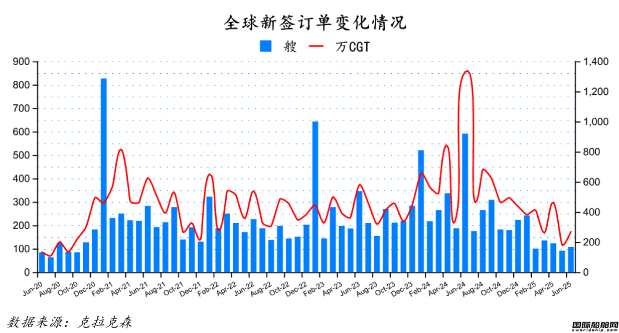 根據(jù)克拉克森最新數(shù)據(jù)統(tǒng)計(截至2025年7月9日),2025年6月份全球新簽訂單106艘,共計2,703,016CGT。與2025年5月份全球新簽訂單91艘,共計1,829,391CGT相比較,數(shù)量環(huán)比增加15艘,修正總噸環(huán)比上升47.75%。與2024年6月份全球新簽訂單591艘,共計13,331,816CGT相比較,數(shù)量同比減少485艘,修正總噸同比下降79.73%。