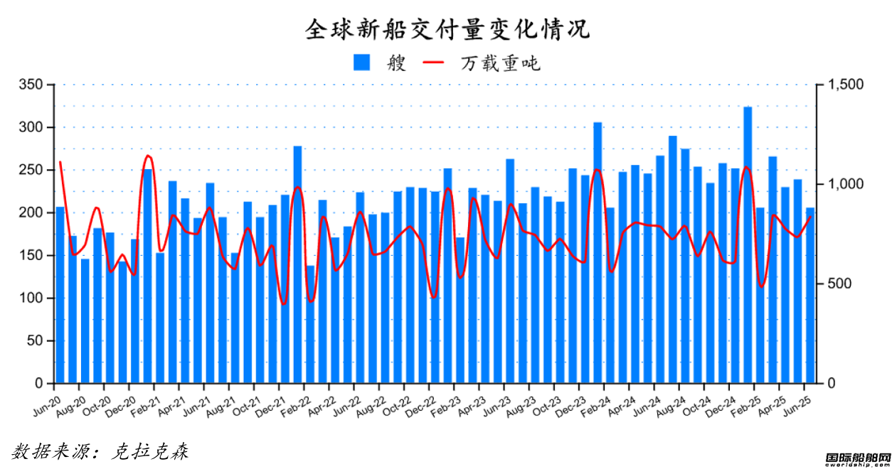 2025年1-6月全球船廠共交付新船1471艘,共計47,757,012載重噸。與2024年同期的全球新船交付訂單1523艘,共計47,882,422載重噸相比較,數(shù)量同比下降3.41%,載重噸同比下降0.26%。