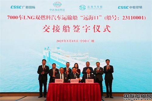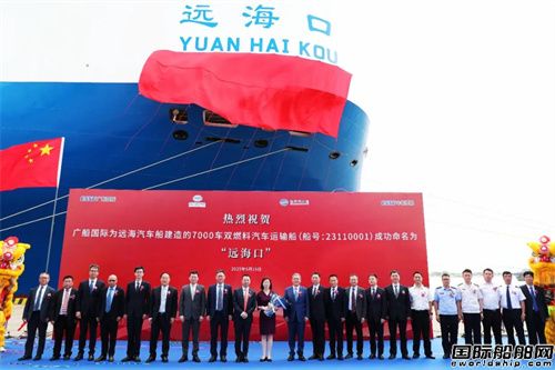 5月15日上午,中國船舶集團廣船國際聯合中船貿易為廣州遠海汽車運輸有限公司建造的7000車LNG雙燃料汽車運輸船首制船“遠?”輪在廣州南沙命名交付首航。